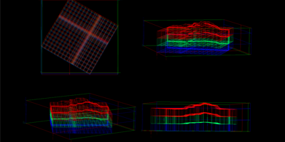 An interactive 3D wireframe of a three layer MODFLOW grid with telescopic mesh refinement and variable layer thickness displayed with Environmental