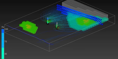 3D Animation created with EVS displaying leachate plume movement in groundwater. The animation shows how concentrations change over time as the groundwater plume flows towards a