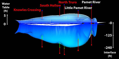 Interactive 3D EVS model of the Pamet Lens freshwater aquifer on Cape Cod. The light blue area shows the aquifer from the water table (top) to the saltwater interface at the